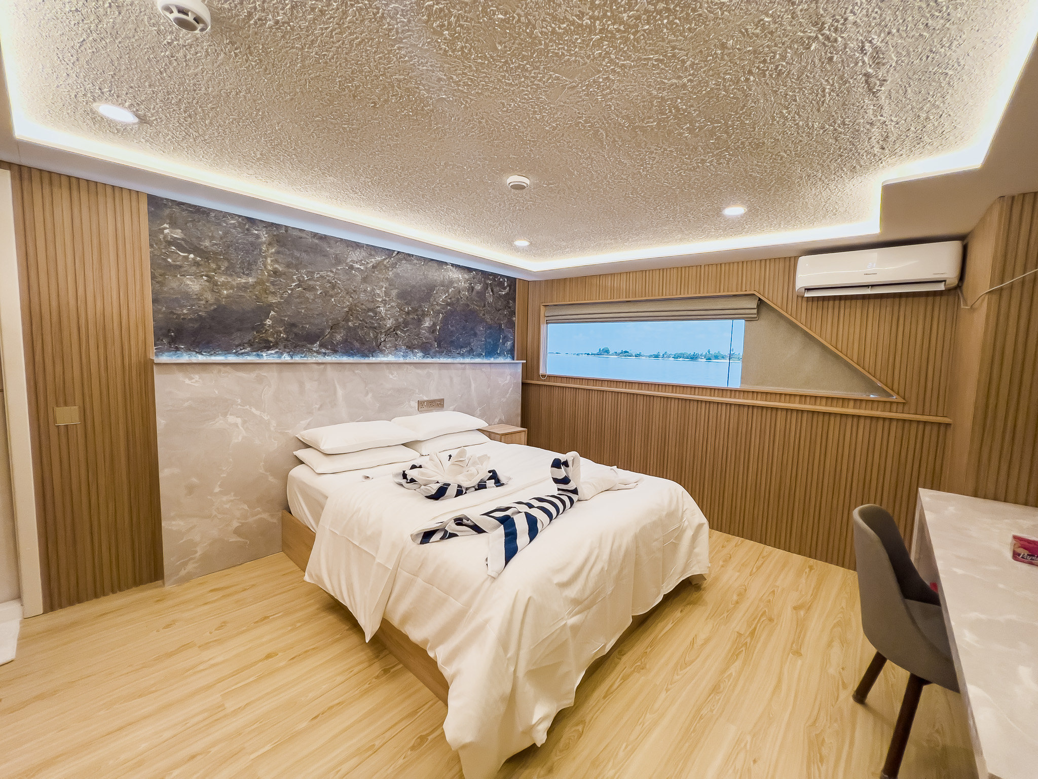 The Maldives Master is a 42m (138ft) built in 2024 specifically as a liveaboard yacht. Â This beautiful vessel carries up to 26 passengers in spacious rooms with individual ensuite bathrooms. The Maldives Master features an indoor dining area, a bar, a sky lounge and an outdoor jacuzzi. A shaded outdoor lounge area can be found on the mid-deck, plus four different sun decks: a viewing deck located at the front of both the mid-deck and upper deck, an open-air deck on the top deck, and an ocean deck at the stern of the boat, all providing comfortable seating and loungers.